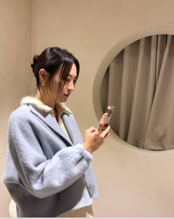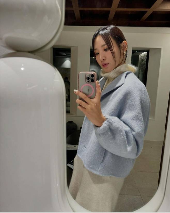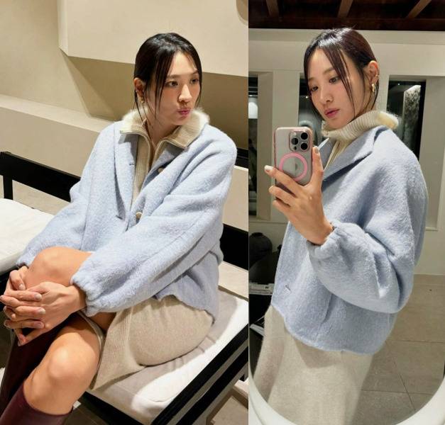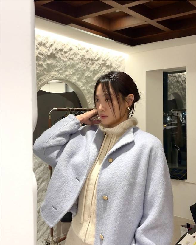 수현은 부드러운 파스텔 블루 코트를 매치해 세련된 겨울 패션을 선보였습니다.