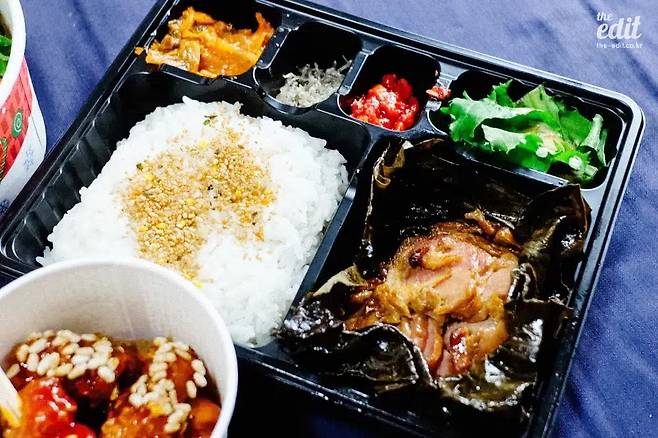 도시락의 이름은 메인 음식을 강조하는 것이 통상적이다. 그렇다면 ‘연잎 오리구이 도시락’의 메인은 연잎에 쌓여 있는 오리구이일 것. 젓가락으로 집어 살살 펼치니, 당장 머스타드에 푹 찍어 먹어야 할 것 같은 기름을 옅게 머금은 오리구이가 나타난다. 연잎은 향을 입히기 위한 것이니, 펼친 채로 두고, 오리구이를 입안에 넣어본다.