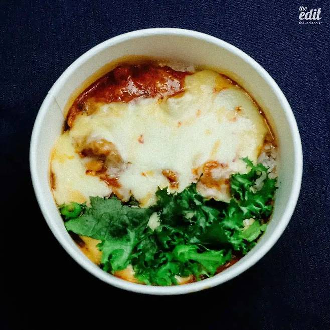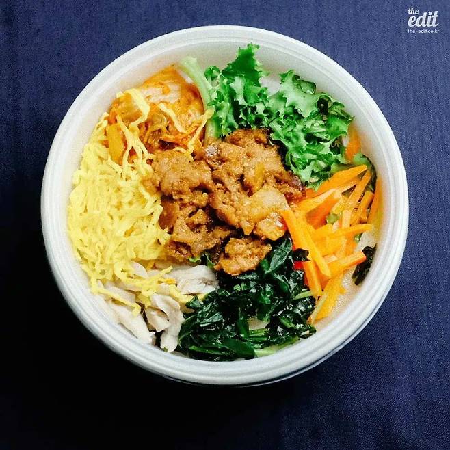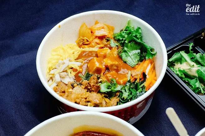 뚜껑을 여니 제육과 지단, 김치, 치커리, 당근, 김 가루, 버섯이 담긴 덮개가 보인다. 그 아래에는 새하얀 밥이 있다. 고명을 탈탈 털어 넣고, 함께 온 두부강된장 소스를 붓고 이리저리 비비고 한 숟갈을 떠먹어본다. 그럴듯하다. 국도 근처에 있을 법한 ‘할머니 강된장’ 간판이 달린 양옥집의 그것만큼은 아니나, 나쁘지 않다. 가격을 생각하면 ‘맛있다’는 생각도 든다.
