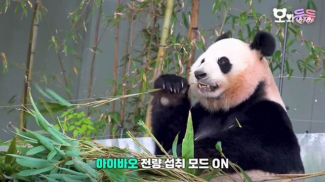 영상 속에는 아이바오의 똑똑함도 고스란히 담겼습니다. 영상 속 오바오는 아이바오를 부르기 위해 문 안쪽을 두드려 신호를 보내고 "혼자 나와" 라고 외쳤는데요. 아이바오는 그 소리에 기다렸다는 듯 성큼성큼 통로로 들어왔습니다. 오바오 언니가 그 누구도 아닌 자신을 불렀다는 사실, 자신이 저곳에 가도 아이들은 안전하다는 사실, 오바오 언니의 부름에 따라 옆 방으로 가면 편하게 밥을 먹으며 쉴 수 있다는 사실 등 모든 것을 알고 행동한 것이지요. 전적으로 오바오 언니를 믿고 있는 똑똑이 사랑둥이 아이바오.. ㅠㅠ 아이바오는 그렇게 아이들을 오바오 언니에게 맡기고 걱정 없는 모습으로 유유히 맛있는 밥을 먹었습니다. 특히 이 장면에서는 그동안 쉽게 볼 수 없던 방사장 문 안쪽 모습, 판다들의 이동 통로도 함께 볼 수 있어 더욱 시선을 사로잡았습니다.