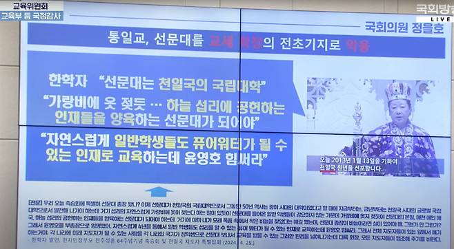 이어 정 의원은 "학생들이 그 산학협력 실습에서 무엇을 했나 살펴보면, 선교활동, 합동 결혼식 같은 통일교 행사지원, 문선명·한학자 자료정리 등을 했다"면서 "이게 정말 교육부가 원하던 산학협력 현장실습이냐"고 따졌다.