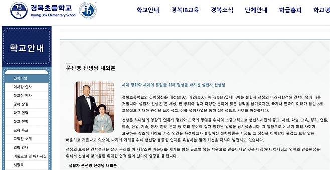 통일교 재단 운영학교 홈페이지에 문선명·한학자 총재 칭송 글