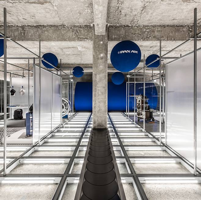 공간의 가변성에 대한 제안은 처음 시안 단계에서부터 꼭 하게 된다. 우리는 브랜드가 6개월 이상 똑같은 디자인으로 공간을 운영하기를 바라지 않는다. MZ세대들은 새로운 것을 좋아하지만 또 쉽게 질려하는 경향이 있어 공간 디자인에 변화를 주는 것은 매우 중요하다. 그래서 ‘이 부분은 이렇게 바꿀 수 있고, 이 부분은 나중에 반드시 이렇게 바꿔야 한다’는 식의 제안이 필요하다. 단, 지속적인 공간 변화를 위해서는 비용을 많이 들이거나 공간 전체를 뜯어내는 식의 복잡한 과정은 지양해야 한다. 팬암 플래그십 스토어의 경우에도 초기에 포인트 컬러로 사용한 파란색을 다른 컬러로 변경하고 투명볼과 유리바닥, 식물 디스플레이 등에 변화를 줄 수 있는 투시도 시안을 먼저 제안했다.