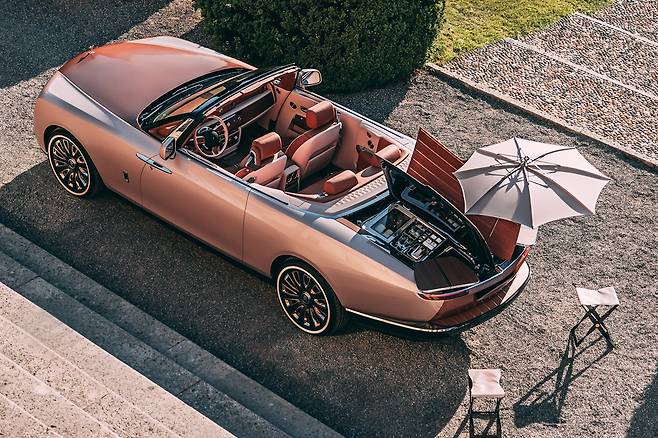 두 번째는 롤스로이스 보트테일(Boat Tail)이다. 겉으로 보면 총 3대가 제작된 모델처럼 보이지만, 각 차량은 외관·내장·옵션 구성이 모두 다르기 때문에 사실상 각각 단 1대씩 제작된 셈이다. 가장 잘 알려진 버전은 피크닉 데크와 파라솔, 크리스털 테이블웨어까지 포함한 사양으로, 자동차라기보다 예술 작품에 가까운 형태로 완성됐다. 가격은 약 2,800만 달러로 알려져 있으며, 브랜드의 ‘코치빌딩(Coachbuilding)’ 기술을 대표하는 모델로 평가받는다.