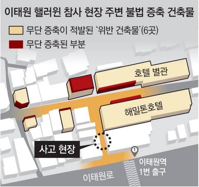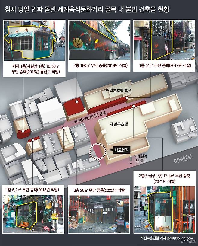 이태원 참사가 발생한 골목의 다른 건물들도 무단으로 면적을 늘려 영업하는 행태를 보이고 있다. 구청에 적발되면 잠시 철거했다 다시 증축하기를 반복해 온 것이다.