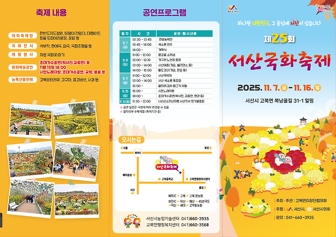 올해로 25회를 맞은 서산국화축제는 2025년 11월 7일(금)부터 11월 16일(일)까지 열흘간 충남 서산시 고북면 복남골길 31-1 일원에서 열립니다.