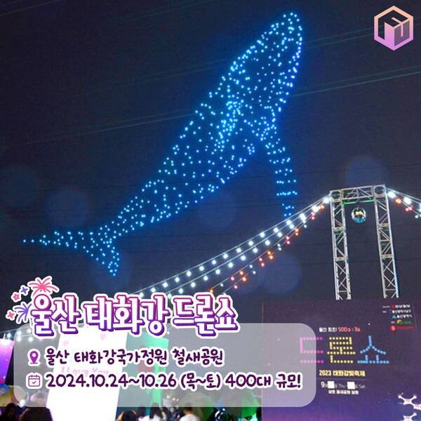 매년 불꽃축제를 개최하던 울산입니다. 2024년에는 태화강 빛 축제의 야간 프로그램으로 드론 공연이 3일동안 펼쳐질 예정인데요. 2024 울산 드론 쇼 일정은 10월 24일 목요일부터 26일 토요일까지입니다. 울산의 대표 관광지인 울산 태화강 국가정원 철새공원 일원에서 개최되며, 매일 400대 규모로 펼쳐질 예정입니다.