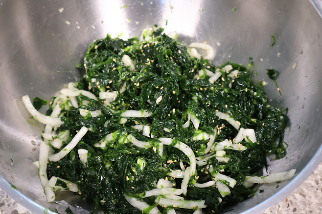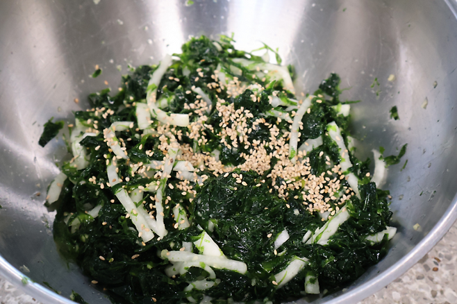 마지막을 통깨를 넣어요. 해조류 요리 할 때는 참기름이나 들기름은 넣지 않아요. 바다향을 헤칠 수 있거든요.