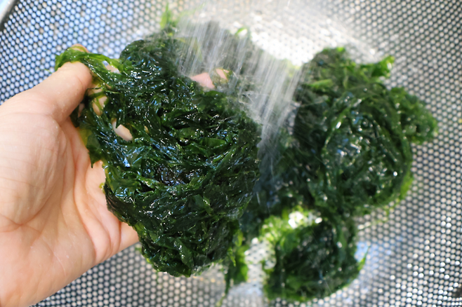 물파래 3덩이 흐르는 물에서 바락바락 씻어요. 이물질은 없는지 잘 살펴보며 씻은 뒤 물기를 꽉 짭니다. 물기를 꽉 짠 파래는 수세미처럼 거친 느낌이 들어요.