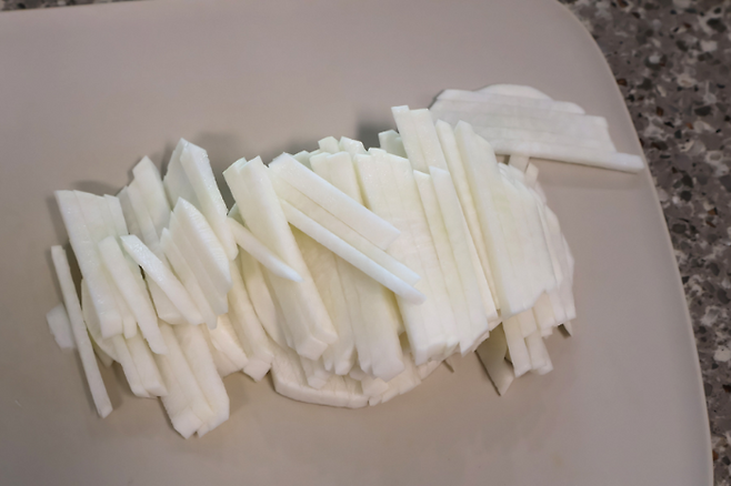 무 250g 정도 필러로 껍질을 벗긴 뒤 채썰어요.