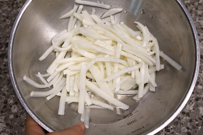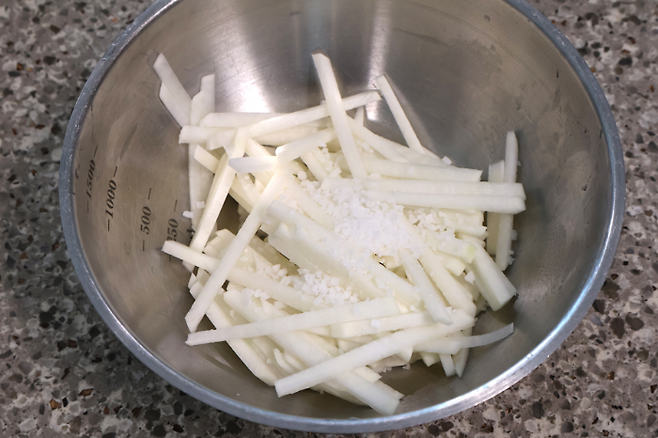채 썬 무를 볼에 담고 굵은 소금 1/2큰술 정도 넣어 버무려요. 약 20분 정도 절입니다.