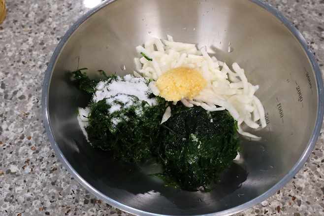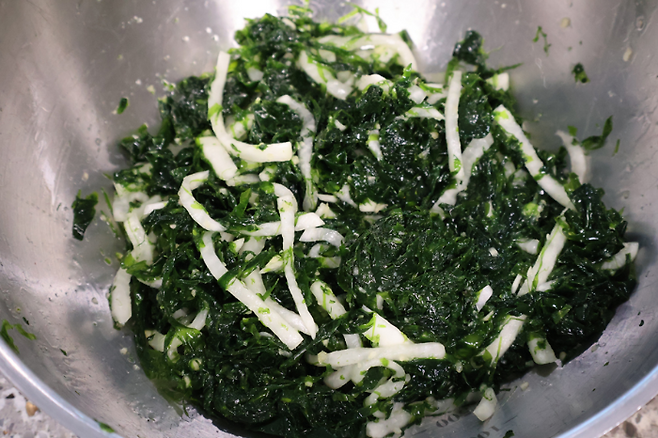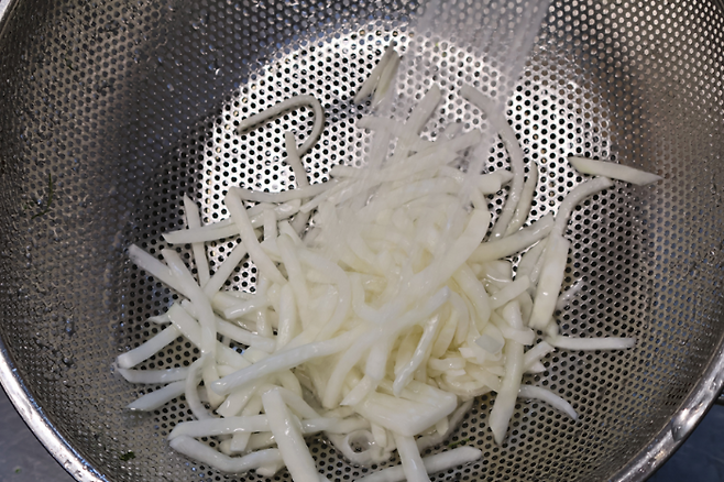 흐르는 물에서 가볍게 씻어 소금물을 빼주고요. 물기를 꽉 짭니다.