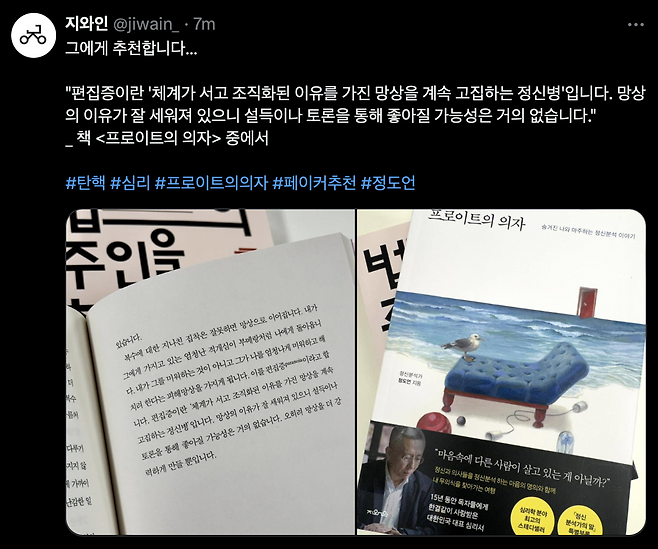 그에게 추천합니다…"편집증이란 '체계가 서고 조직화된 이유를 가진 망상을 계속 고집하는 정신병'입니다. 망상의 이유가 잘 세워져 있으니 설득이나 토론을 통해 좋아질 가능성은 거의 없습니다."_ 책 <프로이트의 의자> 중에서#탄핵#심리#프로이트의의자#페이커추천#정도언pic.twitter.com/D53fHjxvqY— 지와인 (@jiwain_) December 12, 2024