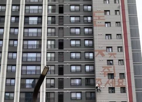 | ▲ 5월 24일 오후 경기 화성시 반월동의 모 아파트에서 한 작업자가 밀린 임금을 달라며 고공 농성을 벌이고 있다. 이 작업자는 아파트 외벽에 매달려 붉은 페인트로 '돈 주세요'라는 글씨를 쓰기도 했다. |