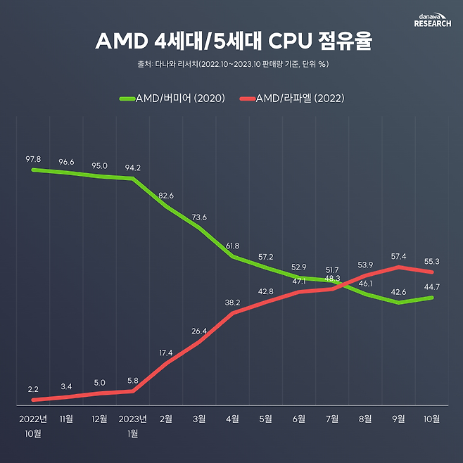 AMD 라이젠 프로세서군 안에서도 골든크로스가 발생했다. AMD 프로세서는 작년 10월을 기점으로 4세대(버미어 외)에서 5세대(라파엘)로 세대교체를 단행했다. 하지만 새로 등장한 5세대는 출시 초반에 비싼 CPU 가격과 비싼 AM5 메인보드 때문에 큰 인기를 얻지 못했다. 그래서 세대교체를 단행한 10월부터 올해 1월까지 극심한 판매 부진을 겪은 바 있다.