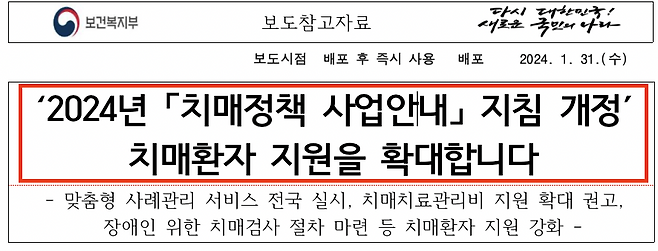 또한 치매 진단을 받은 환자와 가족들을 위해 치매 치료 및 관리 비용 지원을 확대합니다. 의료급여 수급권자와 기초연금 수급자의 경우 치매 치료 약제비와 정신건강의학과 진료비의 본인 부담금 등을 전액 지원받을 수 있습니다. 아울러 치매 환자 가족의 돌봄 부담을 줄이기 위해 주간보호서비스와 단기 보호서비스 이용 시 비용의 일부를 지원할 예정입니다.