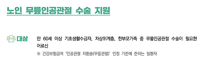 해당 사업은 만 60세 이상의 저소득층을 대상으로 합니다. 건강보험급여 인공관절치환술(슬관절) 인정기준에 준하는 퇴행성관절염 환자로서 의료급여 1·2종, 국민 기초생활수급자, 차상위계층, 한부모 가족에 속한다면 지원받을 수 있습니다. 전국 시군구 보건소에서 본인 또는 가족, 사회복지사 등의 대리인이 신청할 수 있으며, 선정 기간은 1개월 이내에 처리됩니다. 지원금은 본인 부담금의 최대 120만 원(한 측 기준, 비급여 포함, 양측 240만 원 지원)까지 검사비, 진료비, 무릎 인공관절 수술비를 지원받을 수 있습니다.