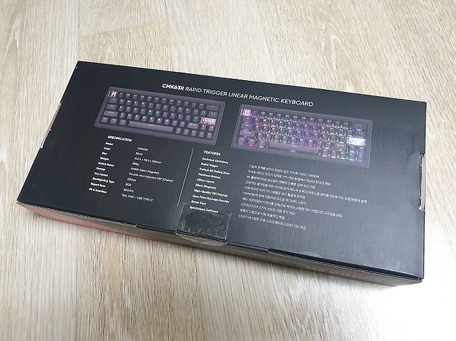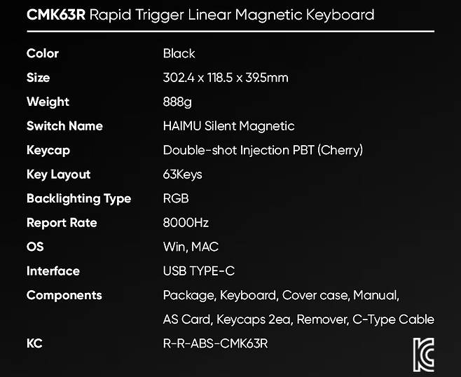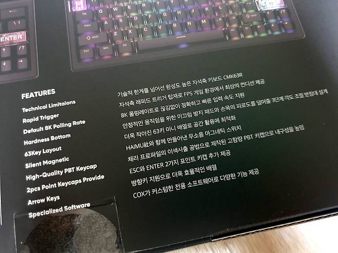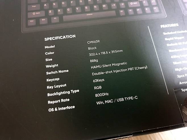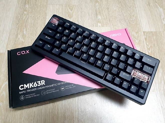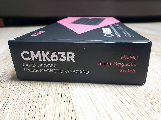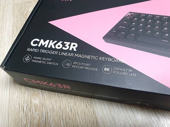 박스 정면에 CMK63R 제품명, 자석축, 2가지 포인트 키캡, 8K 폴링레이트 표기가 있습니다.