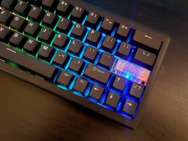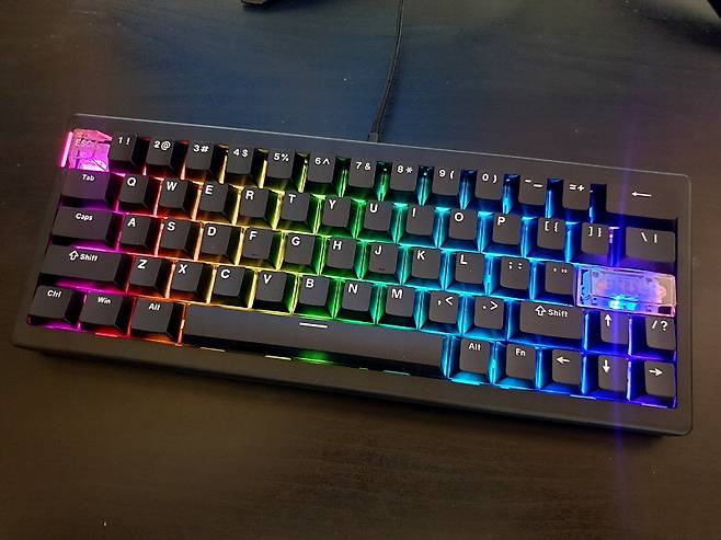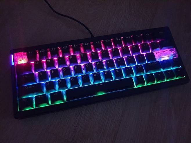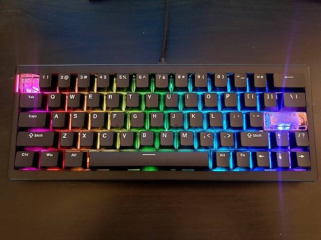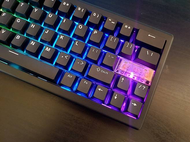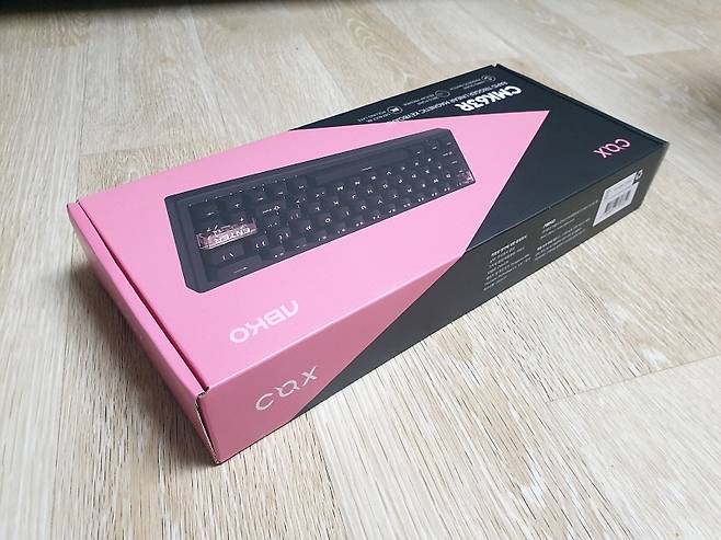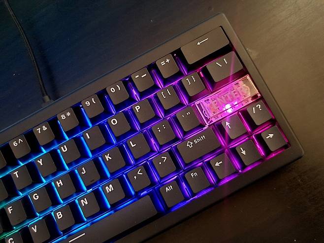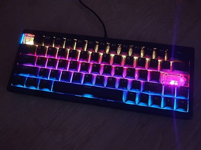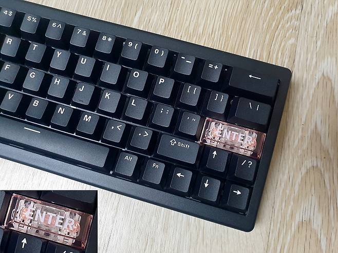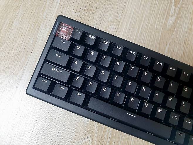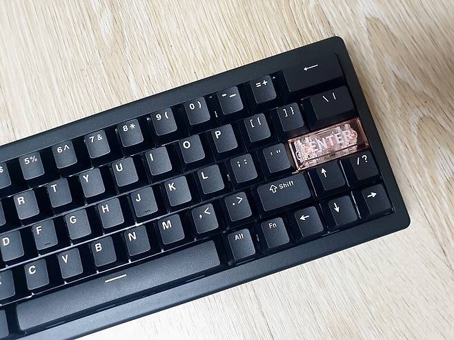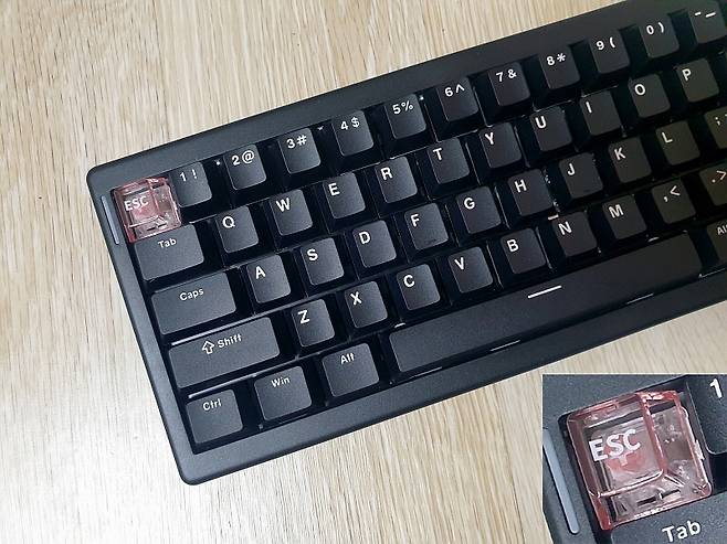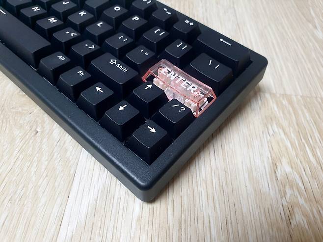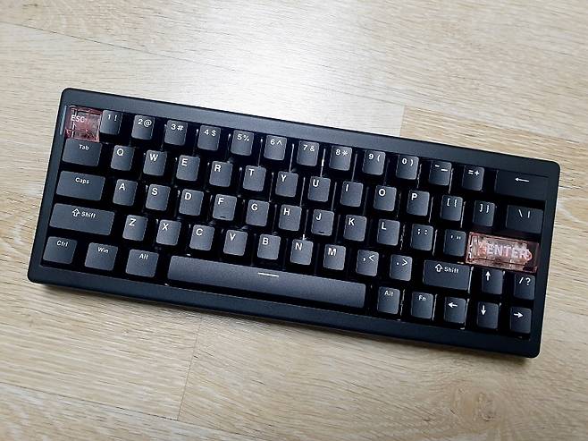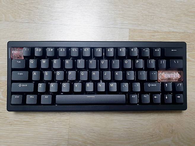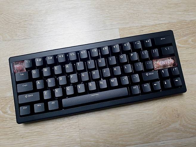 미니 배열의 텐키리스 구조로 ESC키와 ENTER키는 투명한 핑크색 포인트를 줬습니다.