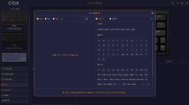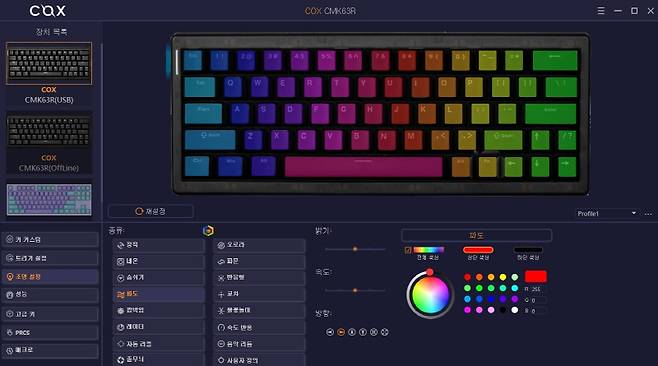 - 콕스 CMK63R 무소음 자석축 기계식 키보드 RGB LED 모드 (효과, 색상, 밝기, 방향, OFF)