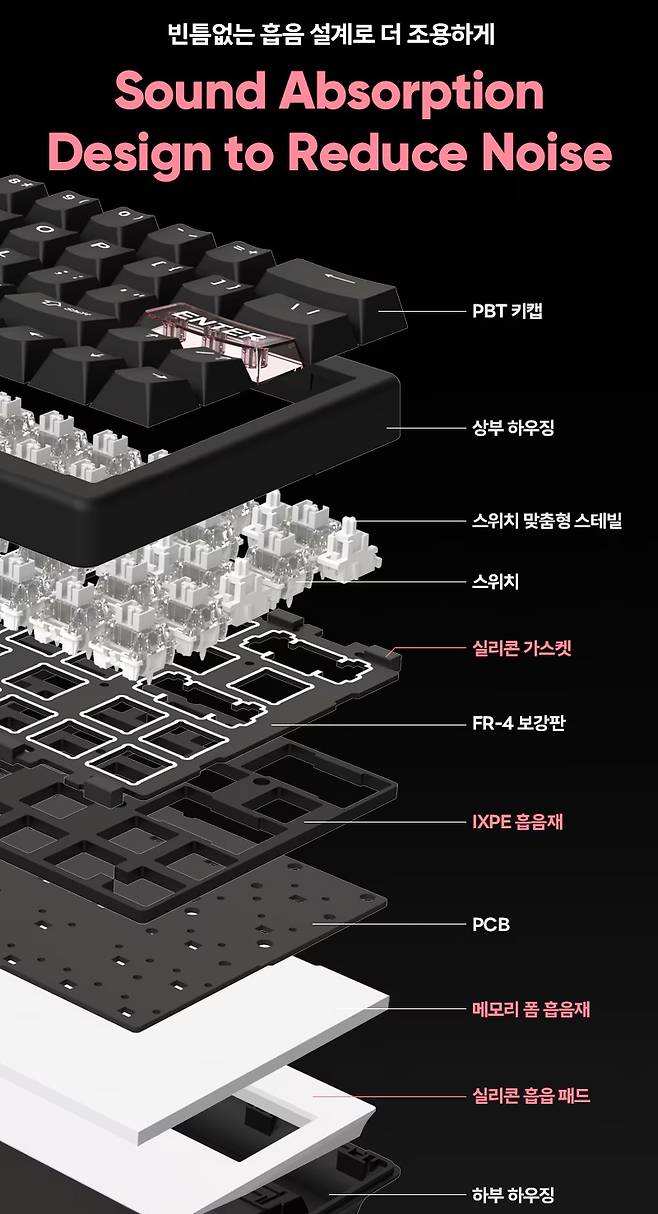 5중 레이어 장착의 흡음 설계 및 가스켓 장착으로 안정적인 타건감에 통울림을 최소화했습니다