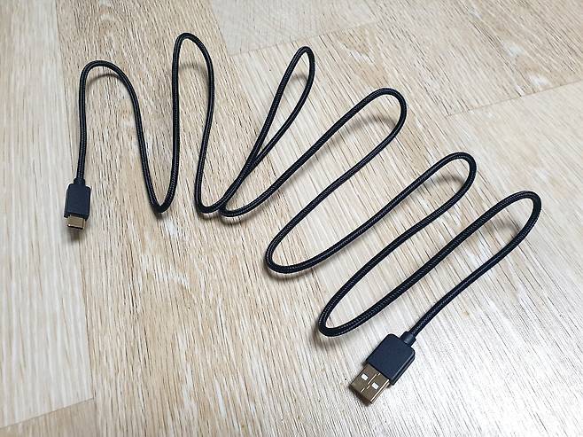 정면에 있으며 USB-C 착탈식 케이블로 유선 연결합니다.