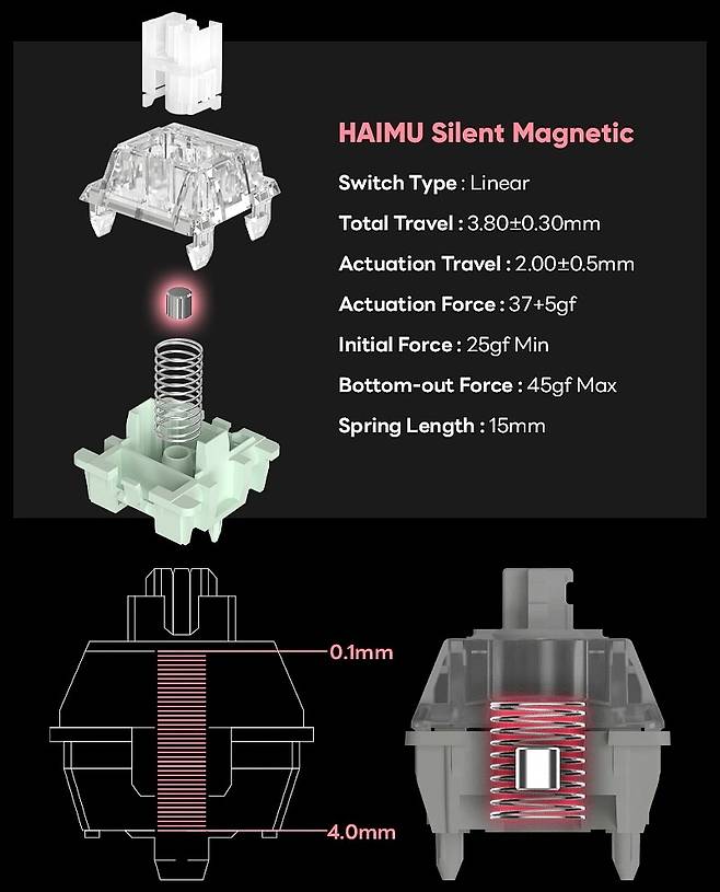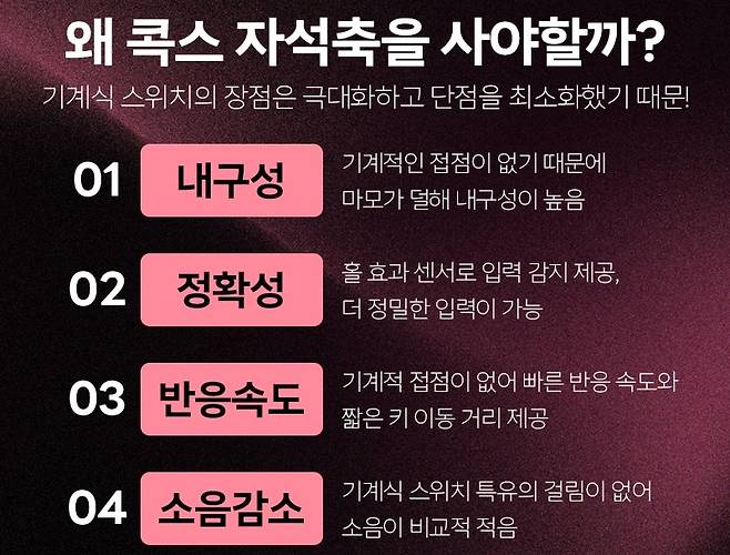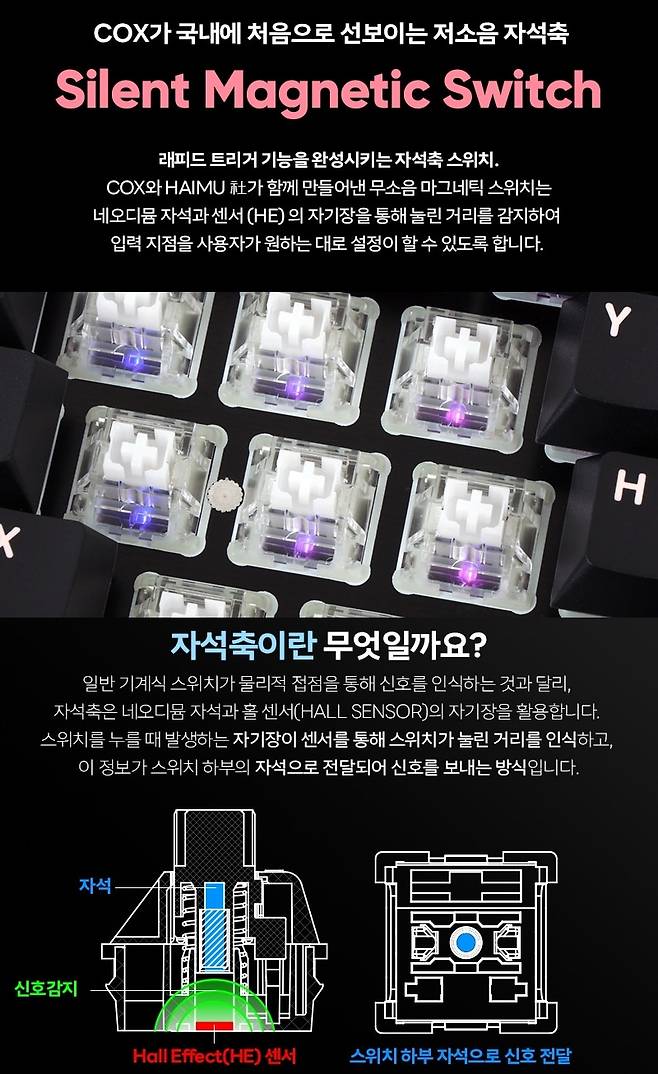 - COX와 HAIMU가 만든 무소음 자석축 스위치로 조용하고 정확한 입력