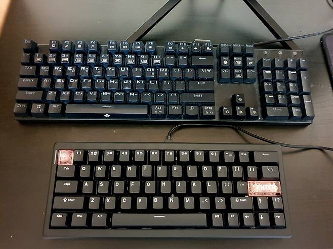 104키 풀배열 기계식 키보드와 63키 미니 배열 COX CMK63R 기계식 키보드 크기 비교입니다.