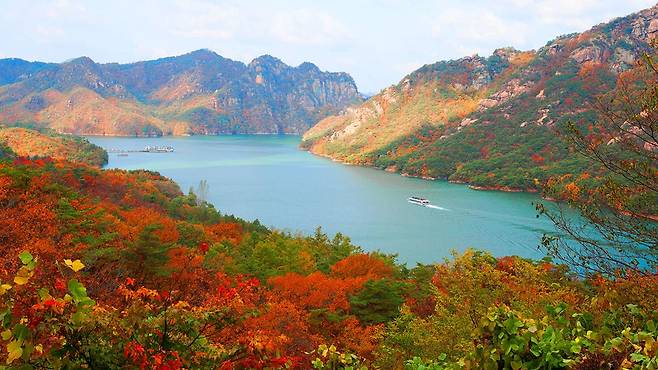 유유히 흐르는 충주호 물길, 그 위를 가로지르는 유람선 한 척, 양옆으로 병풍처럼 펼쳐진 절벽과 붉게 물든 산자락. 이 모든 요소가 겹쳐져 단양팔경의 백미로 불리는 옥순봉과 구담봉이 만들어내는 자연의 수묵화가 완성된다.