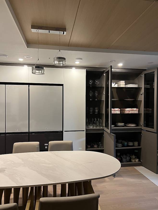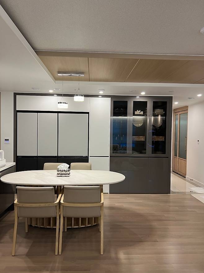 수납공간도 넉넉 : ) 진그레이 그릇장 역시 입주 때 그대로 손대지 않은 장인데요, 남편은 화이트로 재시공하기를 원했으나 저는 이 색감이 나쁘지 않아 그대로 밀고 나갔고 대신 비스포크 냉장고 컬러를 선택할 때 코타 재질의 아이보리+차콜 조합으로 선택하여 톤 앤 무드를 맞춰주었습니다. 올 화이트보다 조금 더 진중하고 고급스러운 느낌이 들어서 남편도 만족했다는 후문! ㅎㅎㅎ