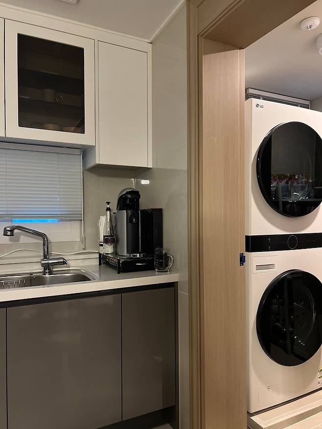 주방 싱크대 옆으로 문을 열고 들어가면 세탁실이 바로 나오는데요, 워시 타워를 배치해 주방 일과 세탁 일을 함께하는 동선을 효율적으로 할 수 있어 좋습니다. 확실히 건조기는 훌륭한 이모님이 맞아요 : )