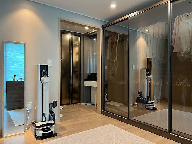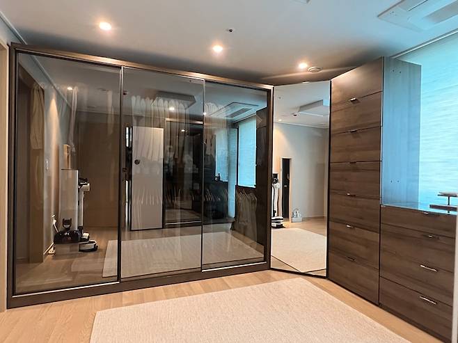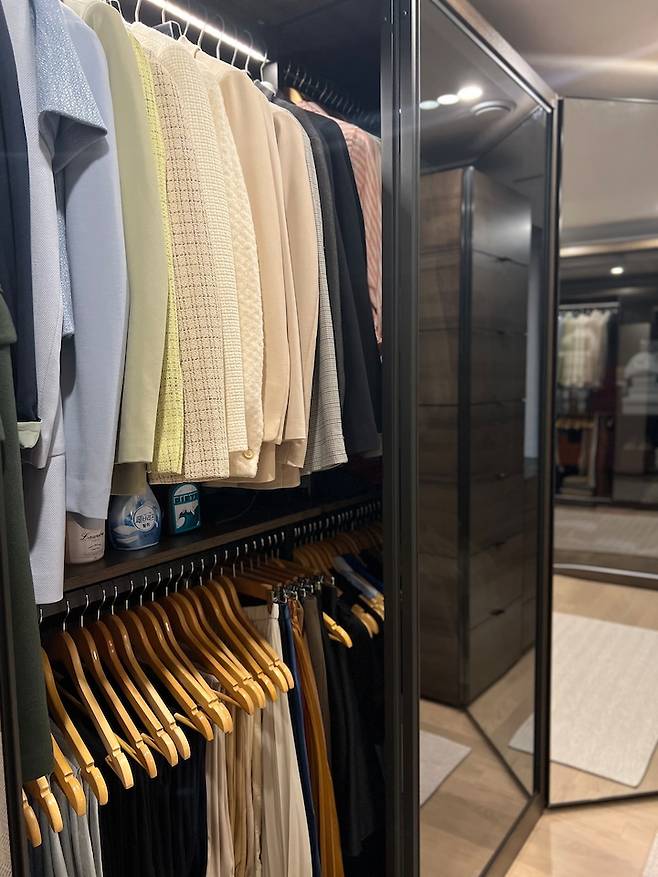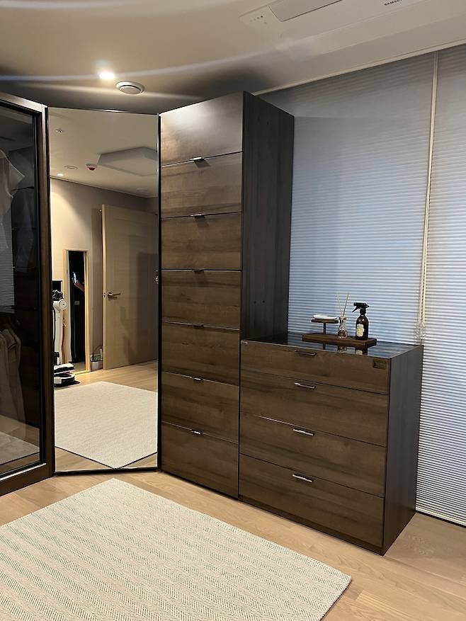 드레스룸의 밝은 바닥톤을 조금 눌러주고 고급스러워 보이는 효과를 주고 싶어 도어를 흑경으로 선택하였습니다. 모듈을 선택하여 집에 맞게 배치할 수 있기 때문에 그 점이 특히 마음에 들었어요! [사진 - 미니 드레스룸 열었을 때]