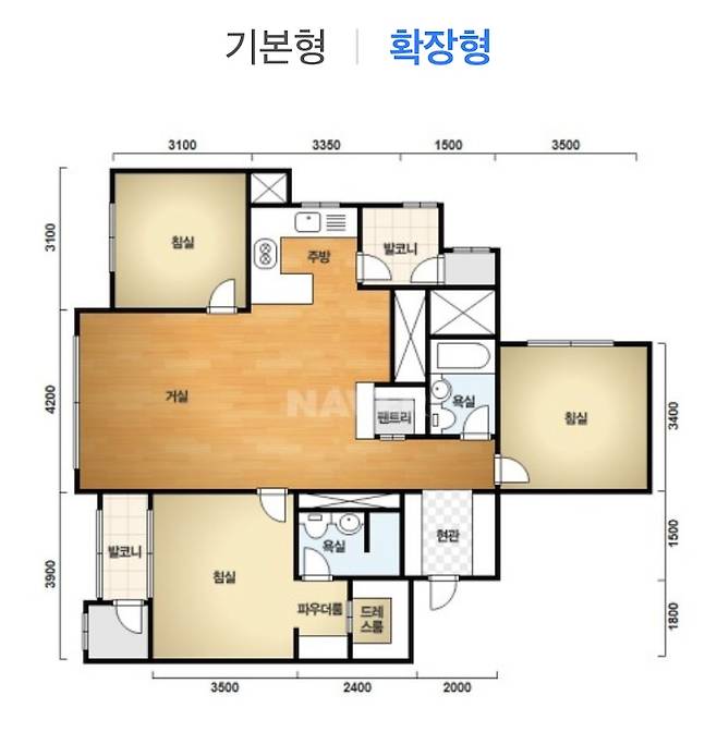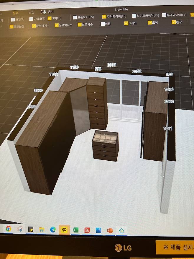드레스장 계약할 당시, 사전점검 이전이라 집의 도면과 실측이 약간 다르게 나올 수 있다고 들어서 약간 보수적으로 공간 너비를 잡고 모듈을 구성하였습니다. (실제로! 완공 후 방들의 너비가 마이너스 5~10cm 씩은 났었던)
