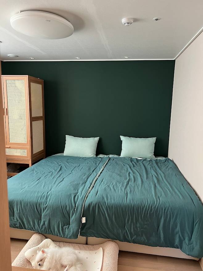 대신 기존 기본 벽에 모션 베드만 덩그러니 배치하는 건 너무 별로라고 생각되어 헤드를 대체할 그린 컬러로 부분 도배 시공을 하였고 침구도 동일 색상인 그린 컬러로 맞춰주었습니다. 어떤가요 코지한 느낌이 드시나요? : )