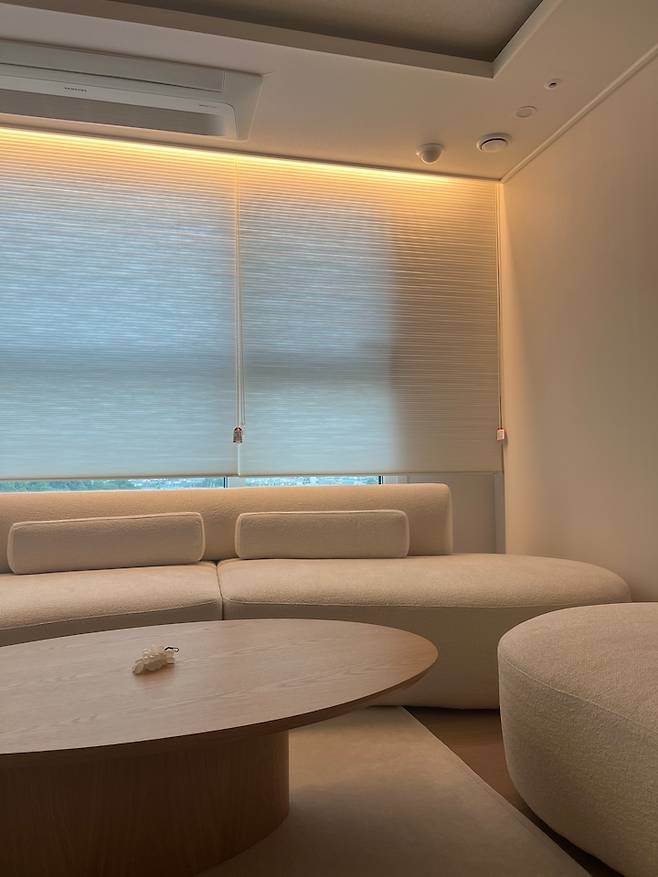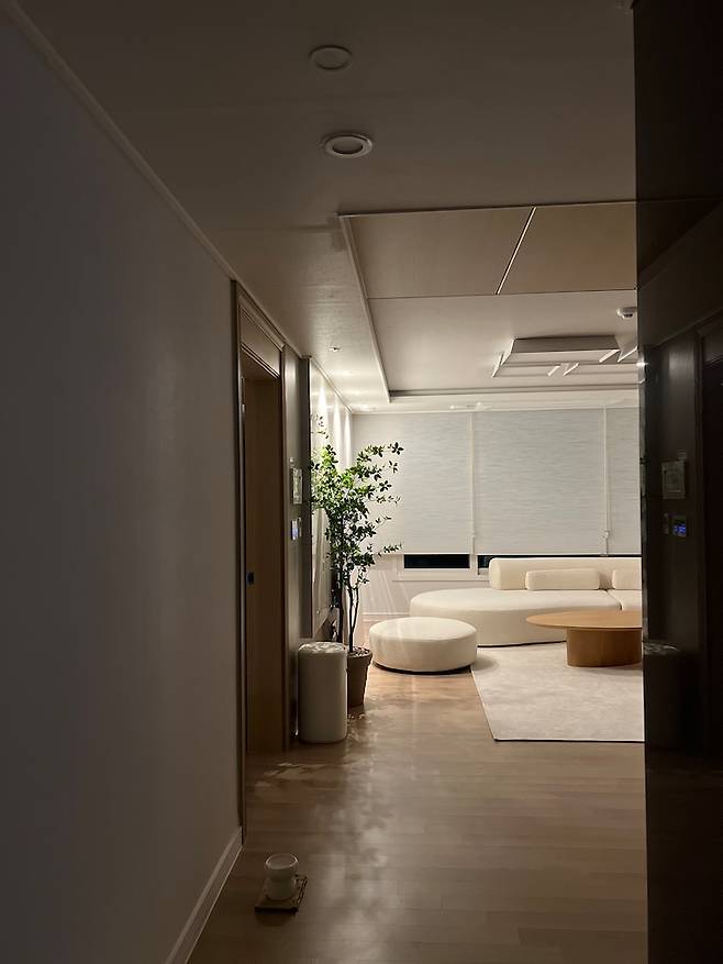 전체적인 톤은 조명 시공을 통해 전구색으로 바꿔주었고 소파는 화이트+약간의 오트밀 색상이 섞인 톤으로 골랐습니다. 잭슨카멜레온의 '잉크 소파' 라인은 언젠가 내 집을 갖게 된다면 이 소파를 꼭 놓고 싶다! 하는 마음속 1순위 가구였기에 망설임 없이 결정했고, 조명 시공은 서치 단계에서 '요즘 전구색보다 주백색을 더 많이 한다'라는 글들을 많이 봤어요.