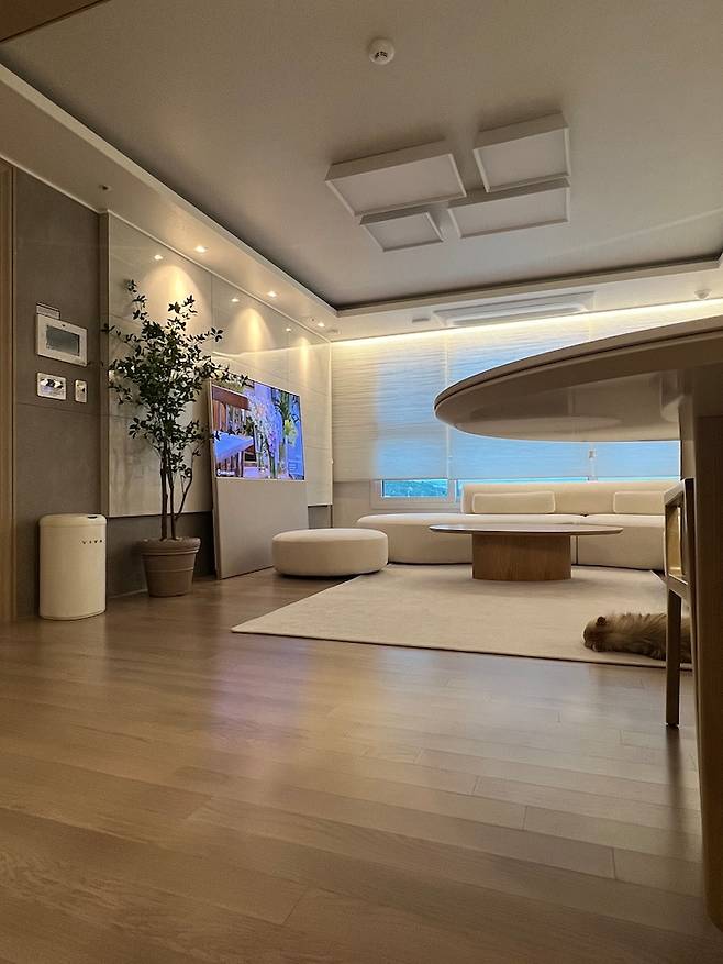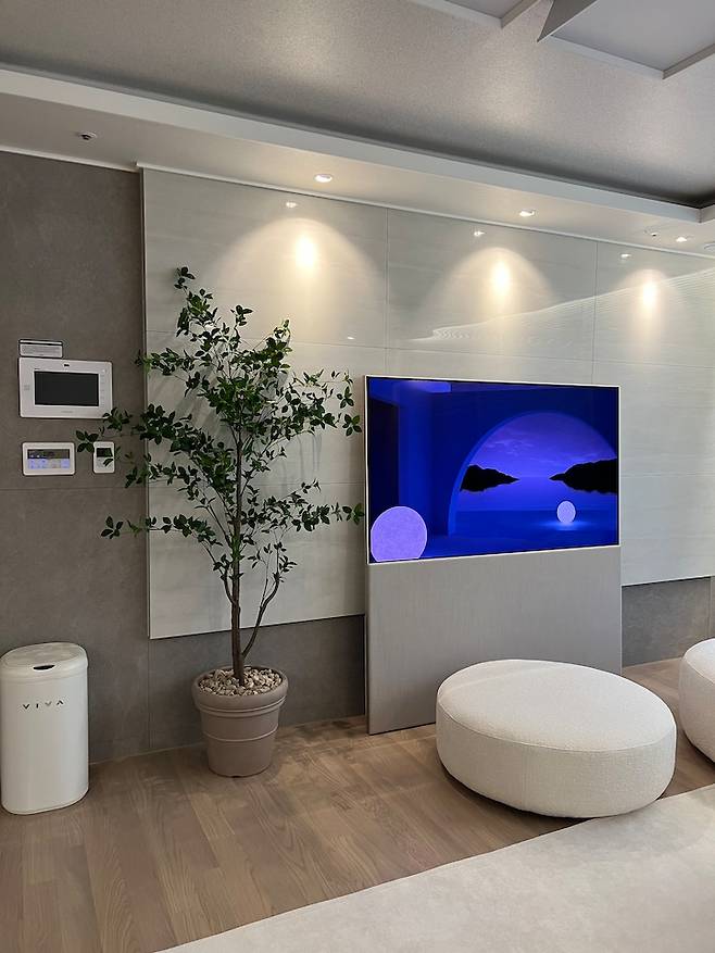 TV 역시 너무 잘 골랐다고 생각하는 가전인데요 : ) 8년간 32인치 TV로 버티다가 입주하면서 새로 들인 친구입니다. 저희 집 아트월은 따로 시공한 게 아닌 입주할 때 그대로의 아트월인데요, 새것이라 고치기는 아깝기도 하고 또 대리석을 철거하는 비용도 만만치 않아서 따로 시공 없이 사용하기로 결정했어요.