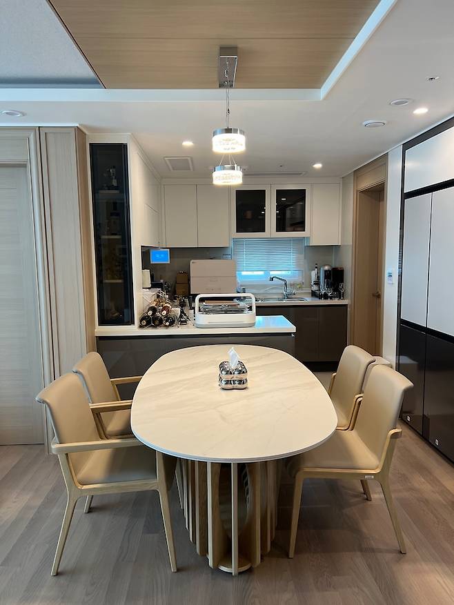 물론 단정하면서 말이죠 : ) 그래서 6인용 식탁에 쿠션감 좋은 의자를 4개만 배치하여 1인이 좀 더 넓게 식탁을 쓸 수 있도록 편안하게 구성해 보았습니다.