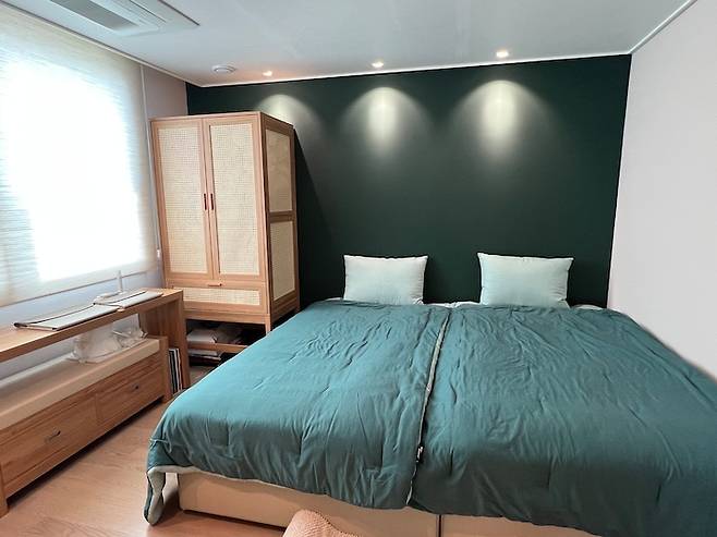 복도에서 바라보았을 때 침대와 그린 톤의 벽만 보이도록 배치하였습니다. 침대 헤드는 생략하였는데 모션 베드이기 때문에 헤드가 특별히 필요 요소가 아니기도 했고, 방 사이즈도 협소했기에 잘한 선택이었던 것 같아요.