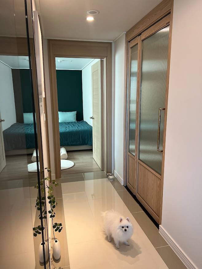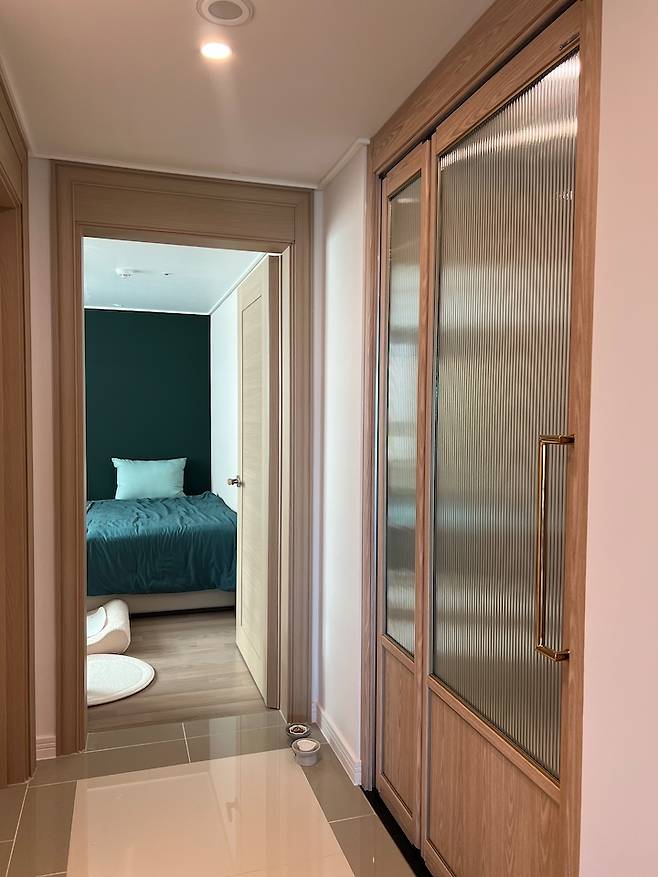 강아지가 두 마리이기도 하고 침실이 현관이랑 가장 가까운 방이라서 중문 시공은 선택이 아닌 필수였습니다. 우리 집에 어울리는 나만의 중문을 색상, 쫄대, 하부 고시, 유리 선택 등을 통해 모두 DIY 하여 업체에서 한 번도 시공한 적 없는 조합으로 완성하였습니다. 업체에서도 샘플로 쓰신다고 할 정도로 예쁘게 나와주었고요 : )