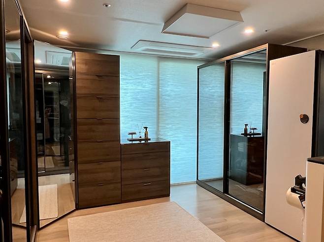 저는 슬라이드 3문 장/ 슬라이드 2문 장/ 미러 오각 장/ 땅끝 장/ 아일랜드 장 조합으로 매장에서 미리 3D 배치 설계해 보고 최종 결정 하였답니다. 슬라이드 2문 장 우측으로 스타일러까지 놓아주니 사이즈가 맞춤처럼 딱! 맞아 떨어졌어요.