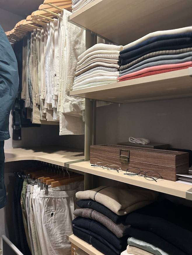 남편 옷은 기존 안방에 딸려있던 미니 드레스룸을 아예 통째로 내어주고 각각 따로 분리 수납하여 서로의 섹션을 침범하지 않는 구성을 하였습니다. (남편 본인은 쪽방 한 칸 내준 거 아니냐 더군요 ㅎㅎㅎ)