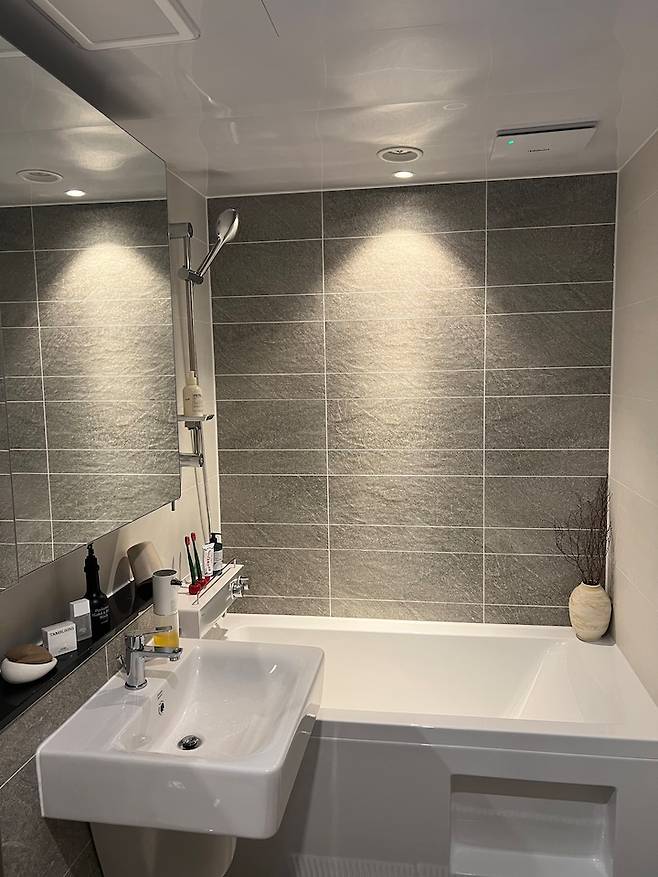 이 욕실의 포인트는 조명 팀장님도 처음 시도해 본다고 하셨던 욕조 벽의 코브 조명! 욕실 벽에 어울릴 거 같아 제가 제안 드렸는데 반신반의하며 시공해 주시고 팀장님이 더 만족하셔서 샘플 사진 찍어가셨던 기억이 있습니다 : )
