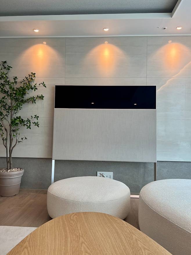다행히 아트월의 색상이 튀거나 촌스러운 느낌은 안 들어서 어울리는 TV를 잘 찾는데 심혈을 기울였죠. 그래서 찾아낸 것이 "LG 오브제 이젤" 65인치입니다. 이 TV는 생소하신 분들이 많을 거에요. 심지어 LG 대리점에 이 모델이 전시되어 있지 않은 매장도 많고 직원분들도 이 모델을 모르시는 분이 있을 정도로요.