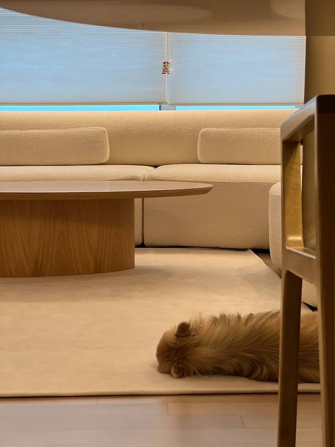강아지 키우시는 집이라면 다들 슬개골 탈구 걱정으로 애견 매트를 깔거나 바닥 시공을 고려하실 텐데요, 저희도 많은 고민 끝에 워셔블 러그를 가로로 길게 빼서 깔아 놓는 방식으로 거실에 배치하고 다이닝 공간 쪽은 생략하기로 했습니다. 어느 정도 마루의 재질이 온전히 보이기를 바랐던 제 바람도 조금 반영해서요 : )