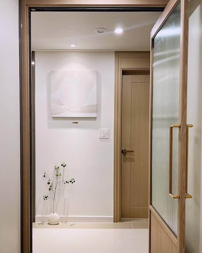 현관 입구에 해바라기 그림을 걸면 집에 돈이 많이 들어온다고 하죠 : ) 남편이 해바라기 그림을 밀었으나 오랜 설득끝에ㅎㅎㅎ 새하얀 달 항아리 그림에 핀 조명 하나를 탁! 쏘는 것으로 좋게좋게 협의를 봤습니다.ㅎㅎㅎ 현관에 초록이도 하나 배치해두고 싶어 하얀 도자기 화병에 간결한 조화 넝쿨 가지를 꽂아주었더니 분위기가 업 되면서 단정해 보여 마음에 드는 포인트 공간입니다 : )