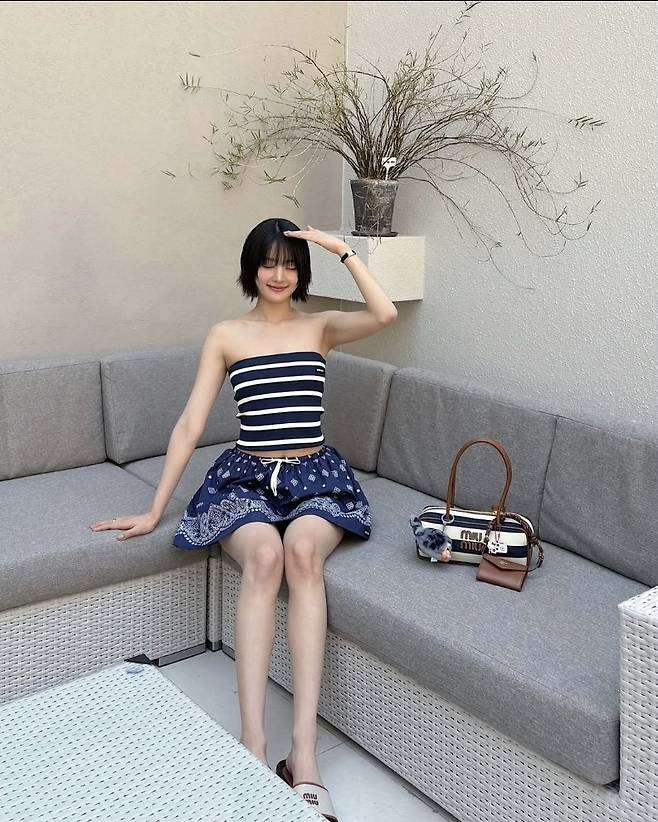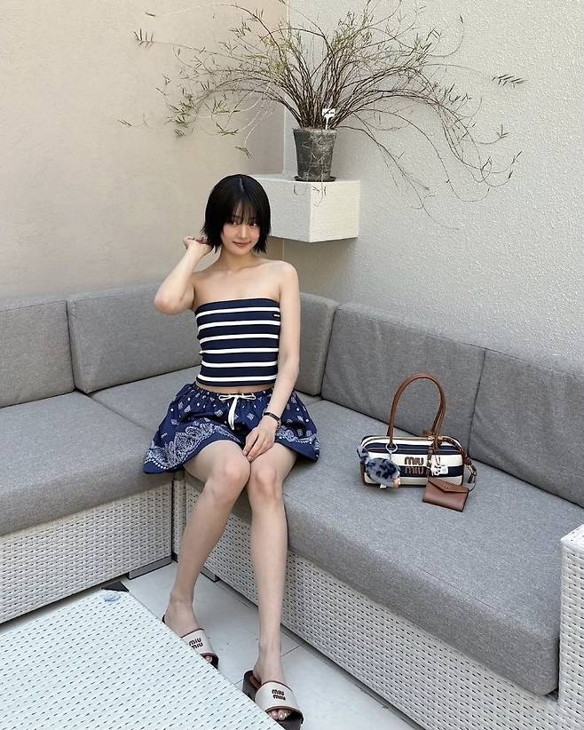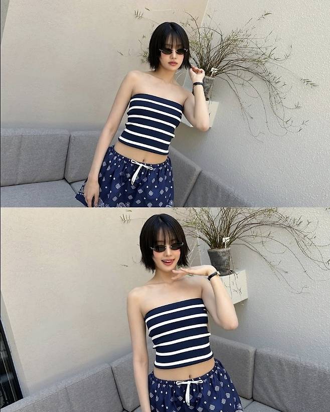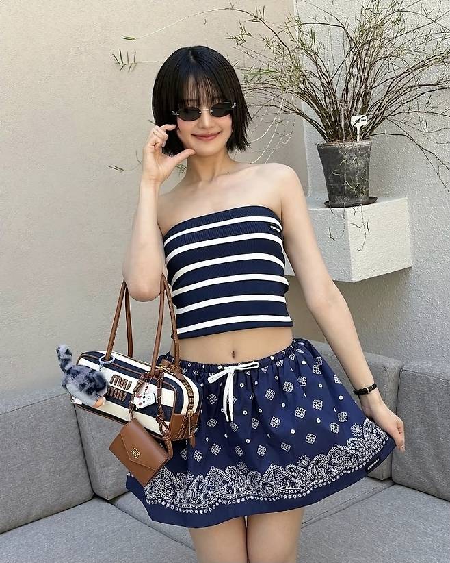 민니는 네이비 스트라이프 튜브톱과 페이즐리 패턴 미니 스커트를 매치해 세련되면서도 발랄한 서머룩을 완성했습니다.