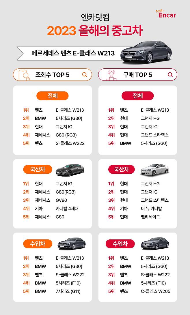 엔카닷컴은 2023년 한 해 소비자 중고차 트렌드를 확인할 수 있는 '조회수 순위'와 '구매 순위' 데이터를 분석했다. 해당 데이터는 올해 엔카 홈페이지 및 모바일 앱을 통해 거래된 120만대 이상의 중고차 데이터를 기반으로 분석됐다. 빅데이터 기반 분석 결과, 벤츠 E-클래스 W213은 올해 종합 검색 조회수와 구매 대수에서 모두 1위를 기록하며 2023년 가장 인기 있는 중고차 모델로 등극했다.