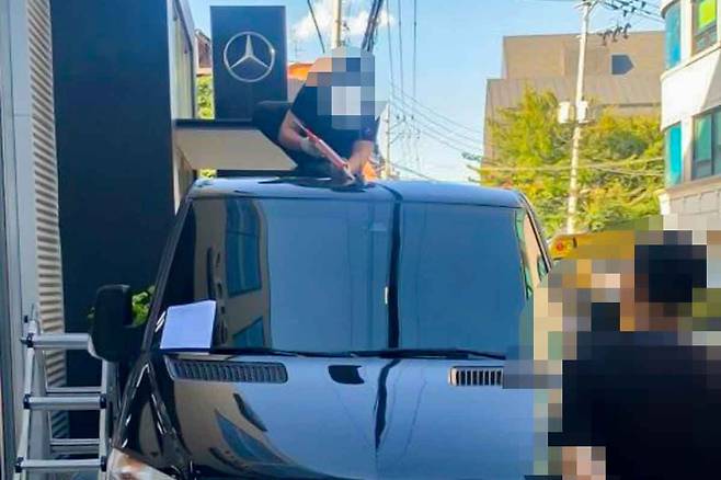 다른 사진에선 벤츠 마크가 크게 새겨진 구조물 앞에서 업체 직원으로 보이는 인물이 해당 승합 차량의 천장에 올라타 실리콘을 쏘고 있었다.