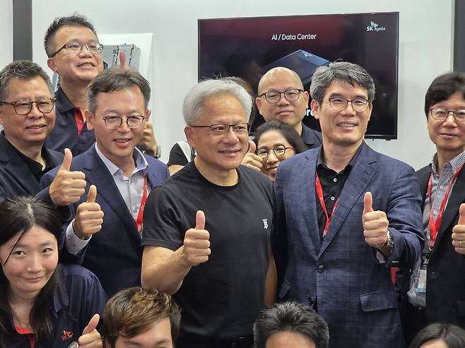 젠슨 황 엔비디아 최고경영책임자(CEO)가 20일(현지시간) 대만 타이베이 난강 전시홀에서 열린 '컴퓨텍스 2025'에 마련된 SK하이닉스 부스를 깜짝 방문해 이같이 말했다.