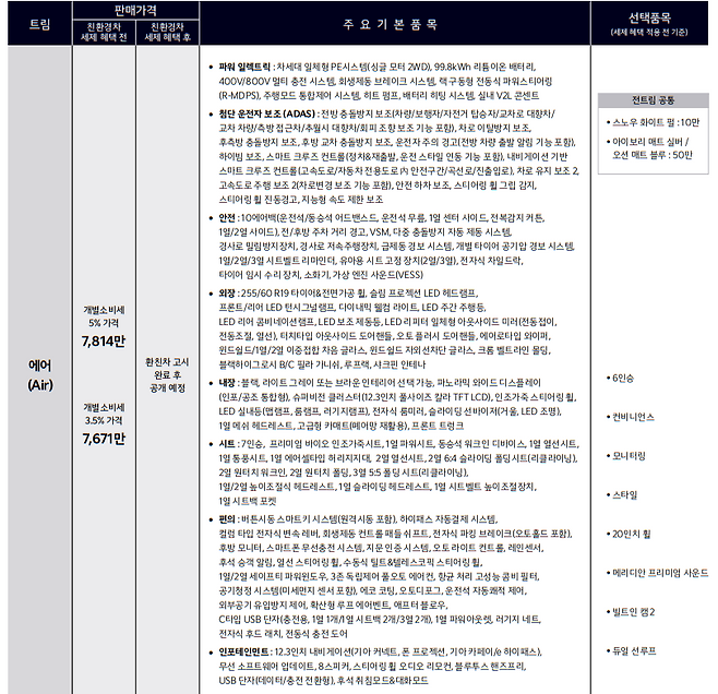 먼저 EV9 기본형인 에어(Air) 트림 가격은 7,671만원이다.(환경친화적 자동차 세제혜택 전, 개별소비세 3.5% 기준)